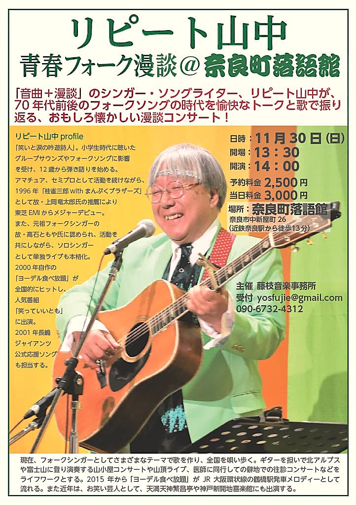 『リピート山中青春フォーク漫談@奈良町落語館』 チラシ